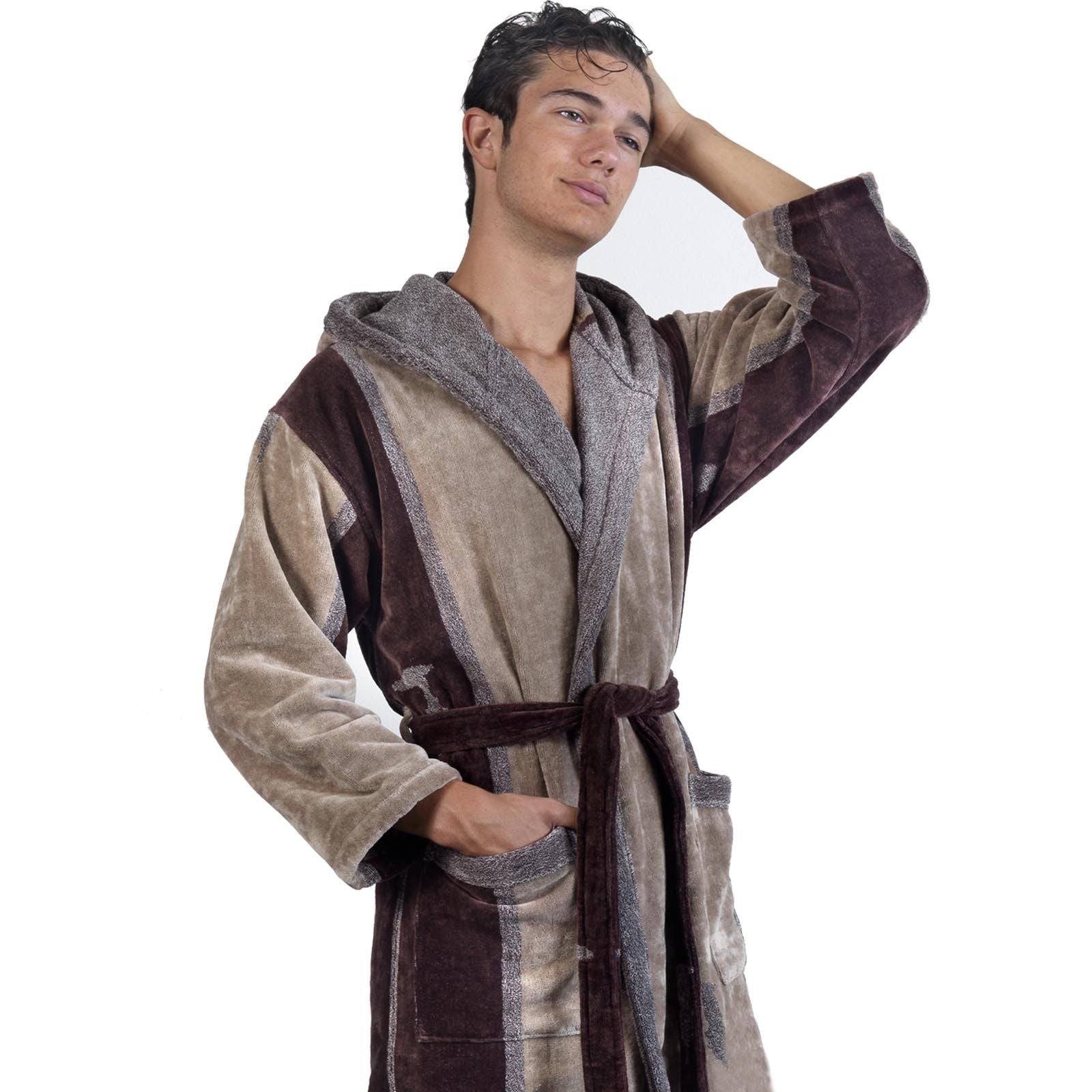 Accappatoio della linea Trussardi home con cappuccio sui toni del marrone e del tortora con loghi del levriero tipico della casa. In spugna cimata 100% spugna di puro cotone 460gr/mq garantisce un’ottima assorbenza.