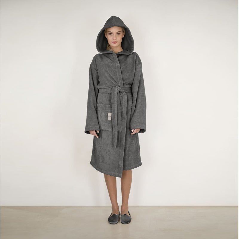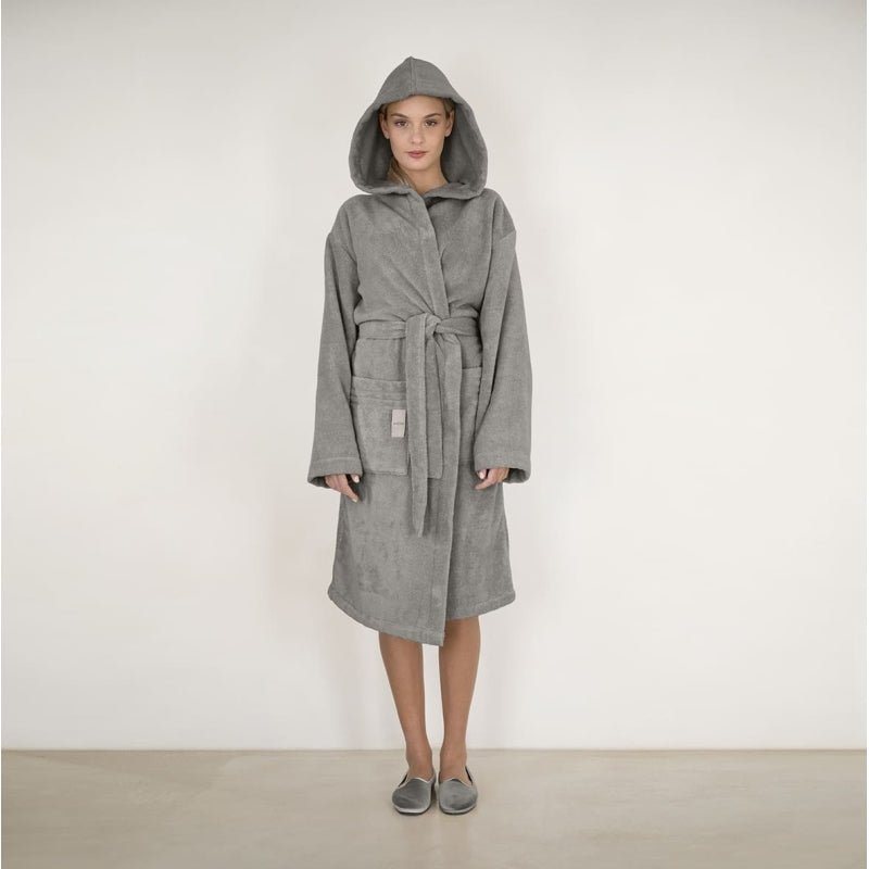 Accappatoio con cappuccio di 550 gr/mq in Microcotone Zero Twist, filato a bassissima torsione che permette all'aria di raggiungere le parti interne del filato, diminuendo il tempo necessario per l'asciugatura e donando al capo una morbidezza eccezionale.