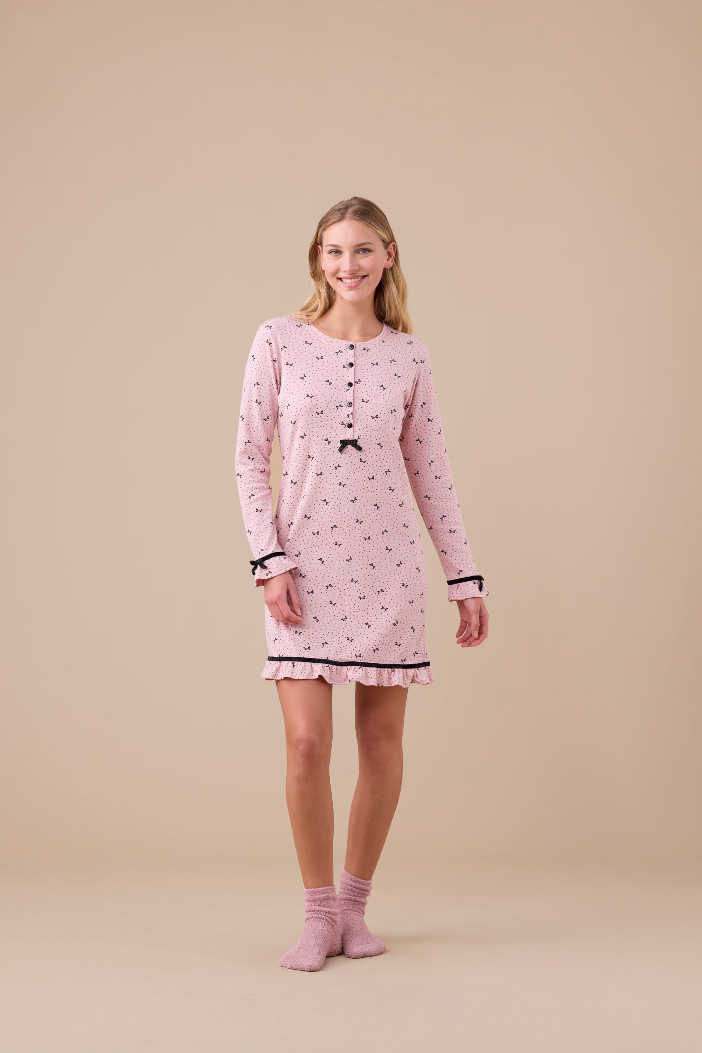 Camicia in caldo cotone con stampa fiocchi, manica lunga e 5 bottoni frontali. Volant e fiocchetti neri in velluto.