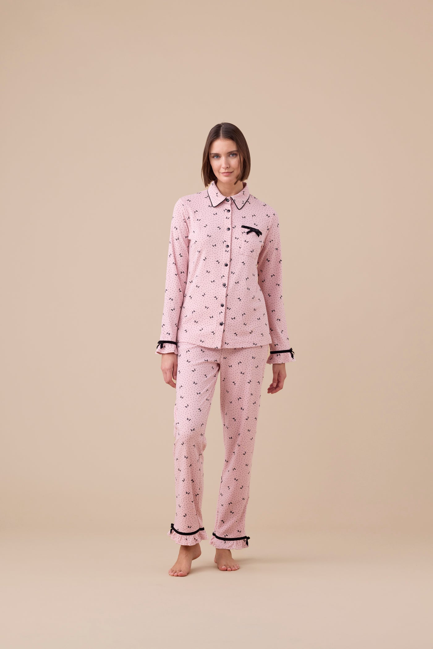 Pigiama donna in caldo cotone con fantasia fiocchi. Camicia con bottoni e pantaloni con volant per un look romantico e confortevole.
