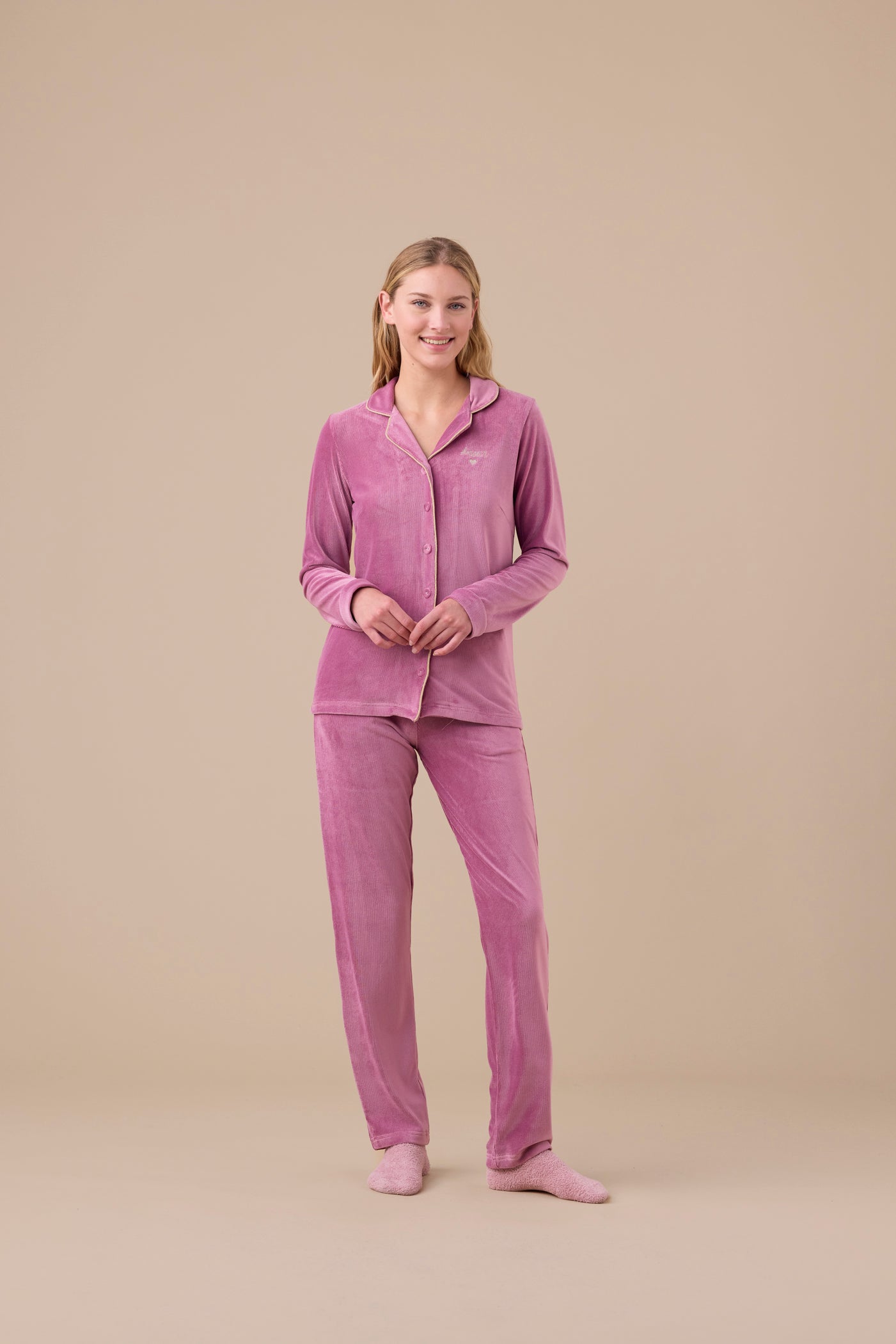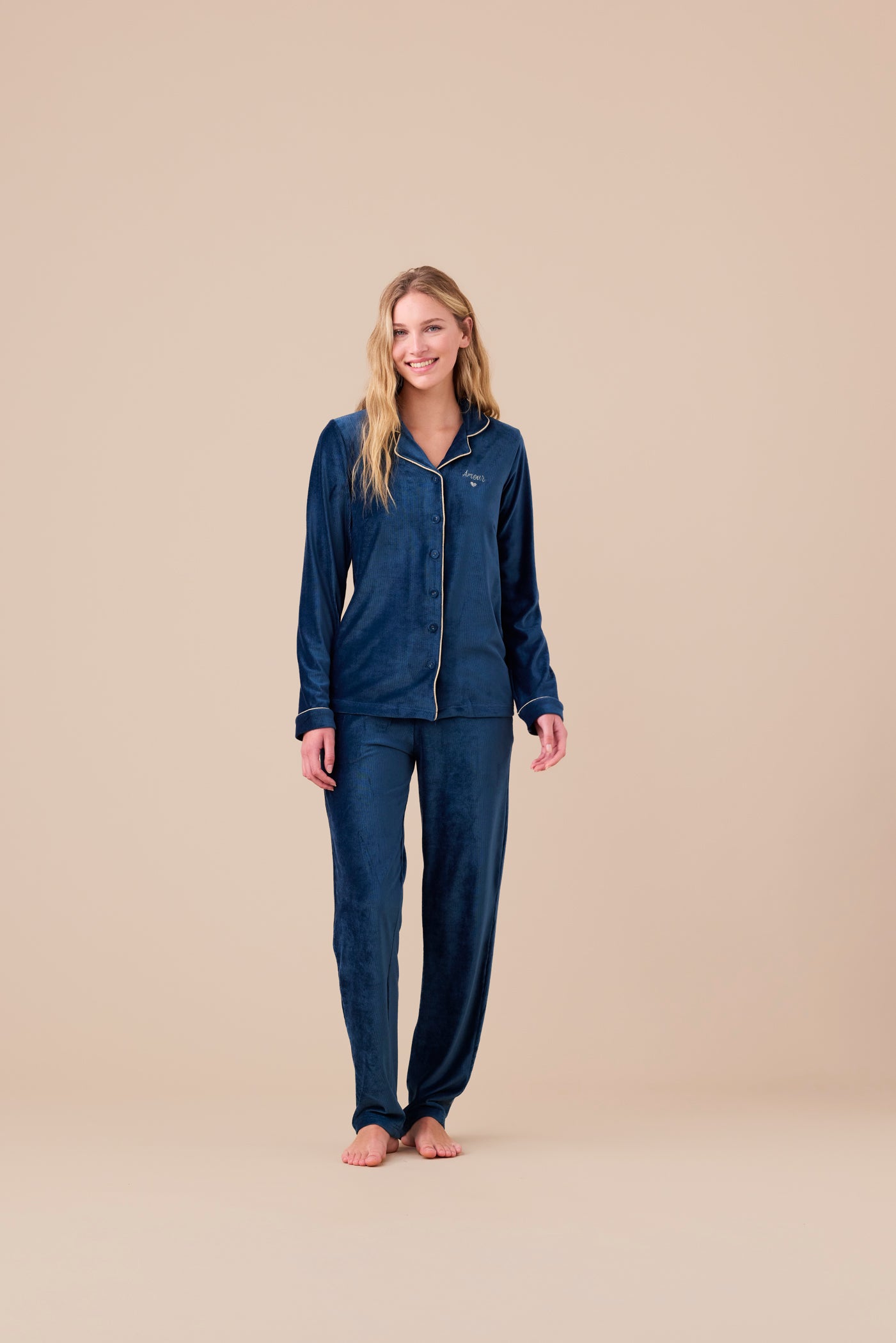 Pigiama donna in ciniglia a coste e piping a contrasto. Top con abbottonatura sul davanti e dettaglio scritta ricamata e pantaloni con tasche.