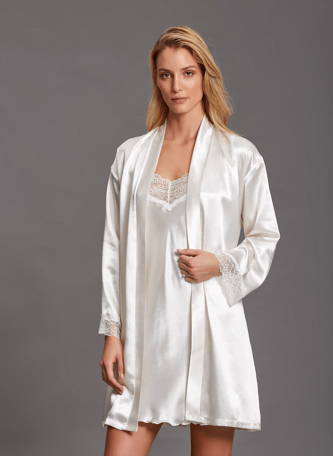 Vestaglia e Camicia da Notte in Raso con Pizzo.
