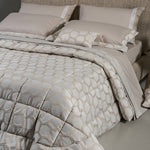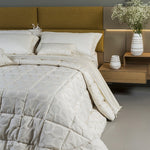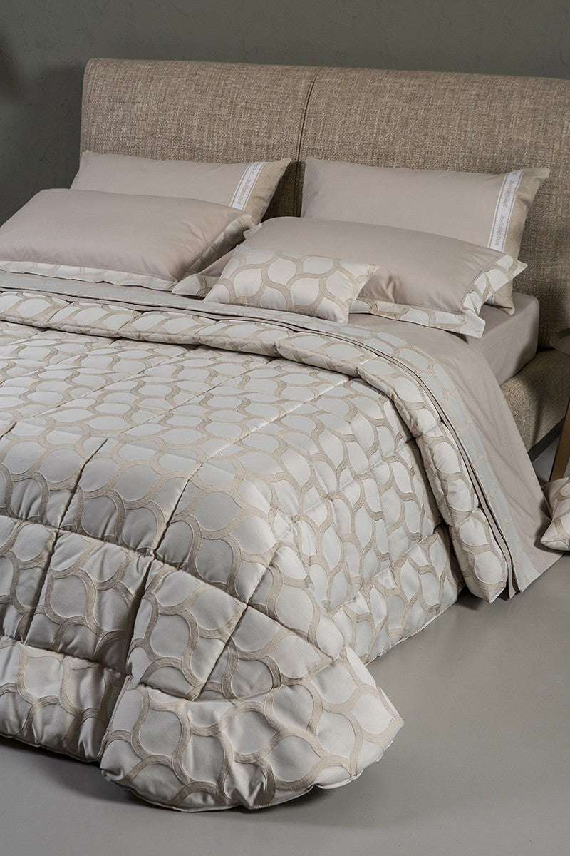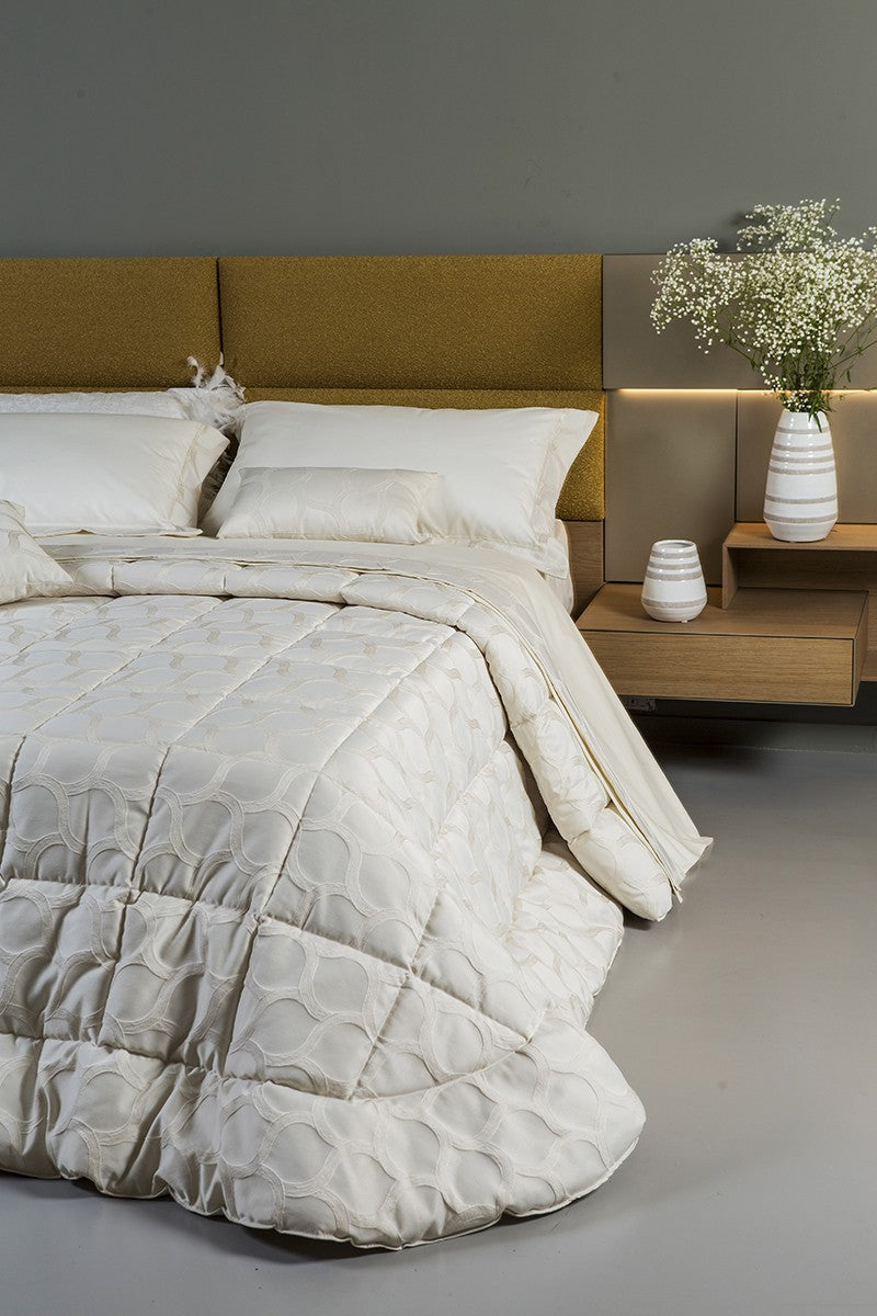 Trapunta in pregiato tessuto jacquard con disegno esclusivo a rilievo. Realizzata artigianalmente e 100% Made in Italy