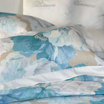 Completo lenzuola matrimoniale modello copriletto con stampa piazzata, federe a 3 volani con stampa piazzata, lenzuolo sotto in raso tinta unita, logo Blumarine stampato nella trama.