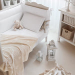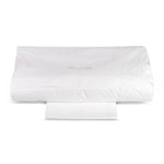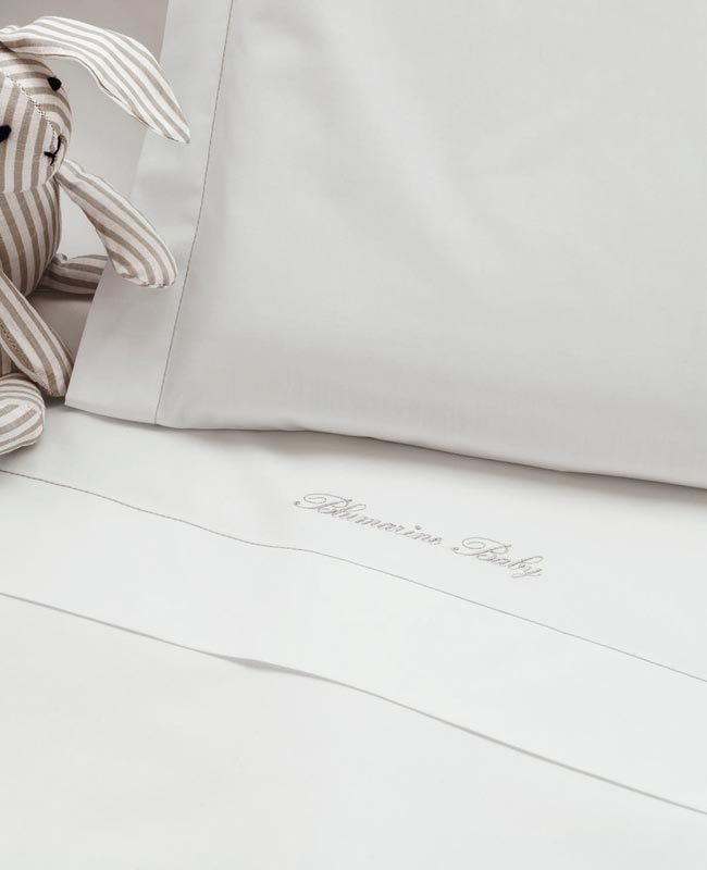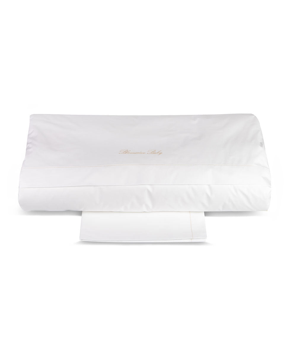 Completo copripiumino per lettino in 100% percalle di cotone, con logo Blumarine ricamato in diversi colori, federa con volano laterale e interno estraibile.
