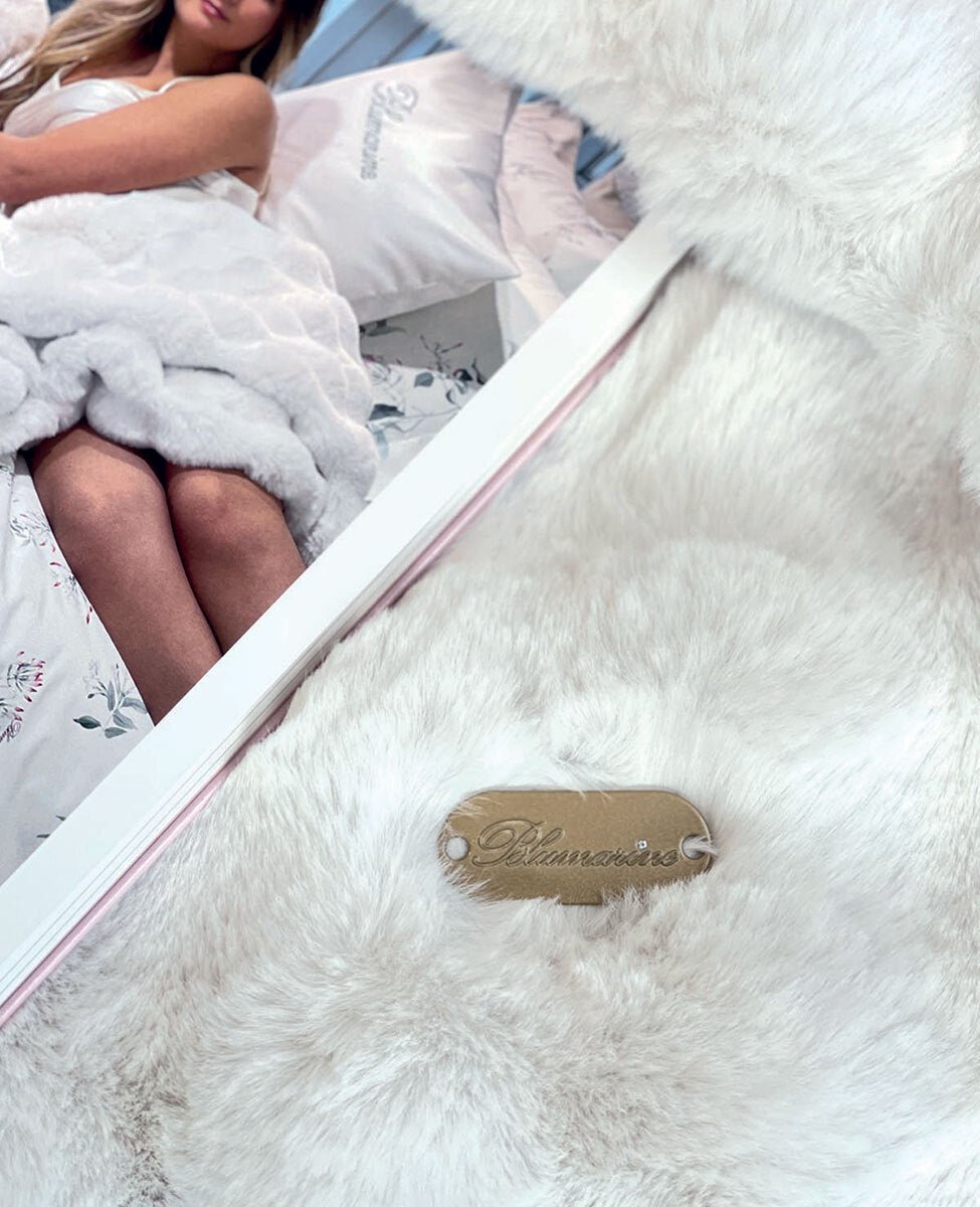 Coperta in ecopelliccia matrimoniale con placchetta con logo Blumarine e punto luce in cristallo, retro in velluto tinta unita.