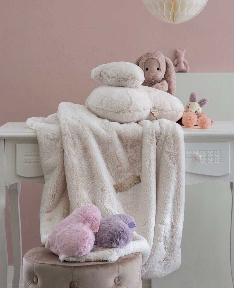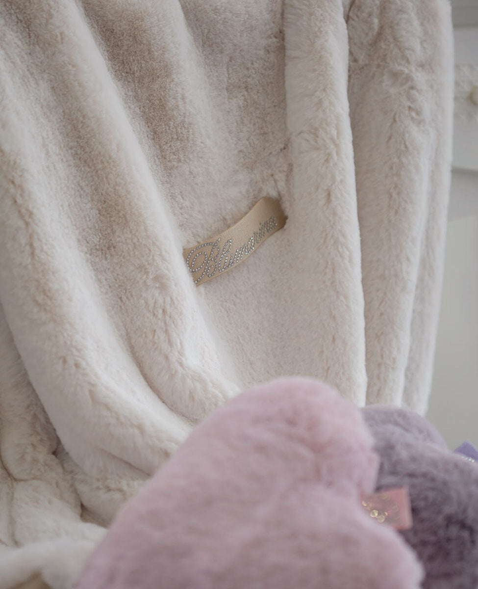Plaid per culla in morbidissima pelliccia sintetica con logo Blumarine in cristalli su nastrino canetè e retro in velluto tinta unita.