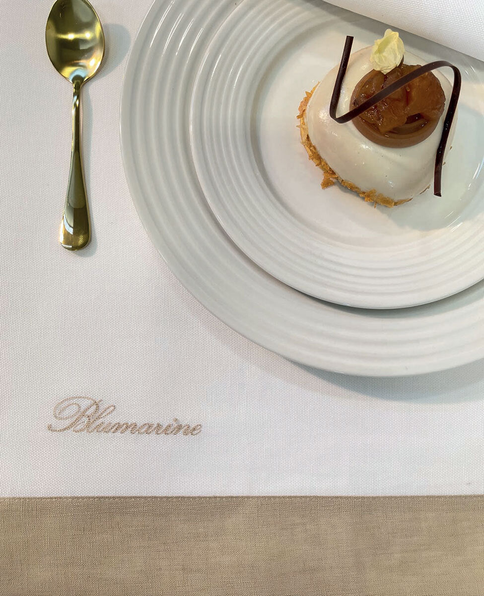 Tovaglia per 12 posti tinta unita bianca con bordo colorato in lino rimesso in applicazione alto 9,5 cm, logo Blumarine ricamato in tono con le fasce, elegantemente confezionata in scatola, perfetta come idea regalo.