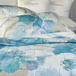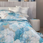 Copriletto trapuntato matrimoniale con stampa all-over su raso di cotone e logo Blumarine stampato nella trama.