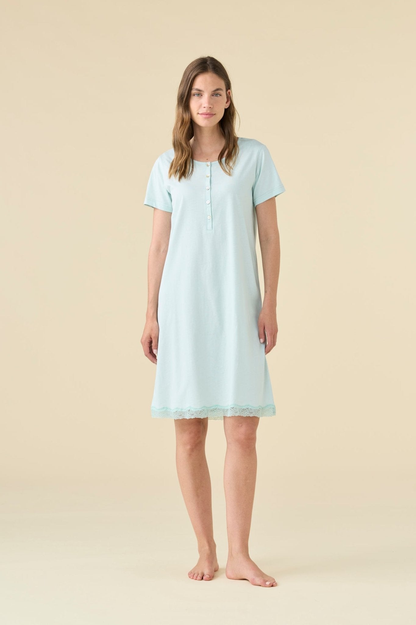 Camicia calibrata mezza manica, tinta unita con applicazione di pizzo sul bordo.