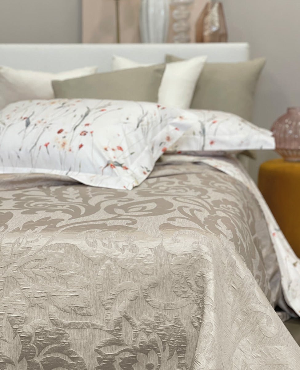 Copriletto liscio non trapuntato matrimoniale con trama jacquard, rifinito con orlo di 6 cm ed angoli smussati.