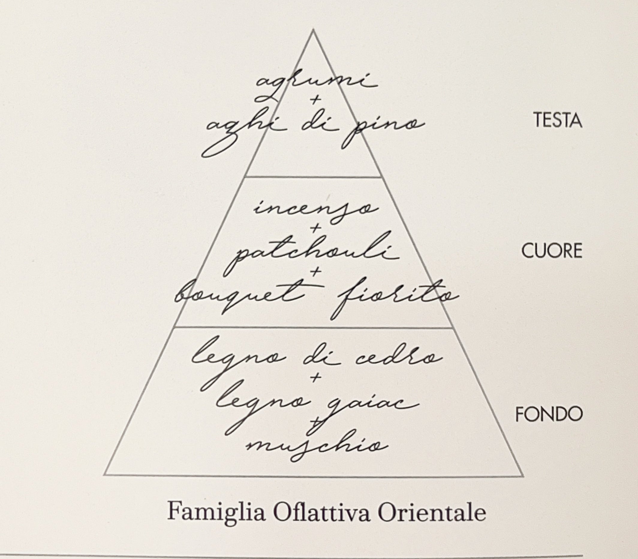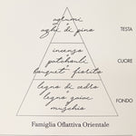 Accenti frizzanti e balsamici animano questa fragranza orientale dal ricco cuore incensato e fiorito, accompagnato ad un dolce fondo legnoso.