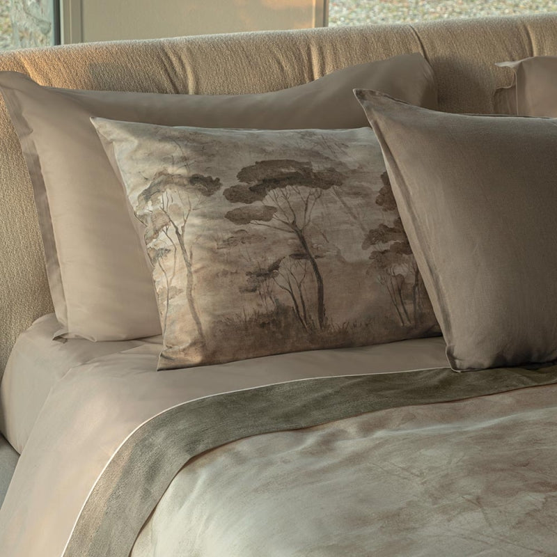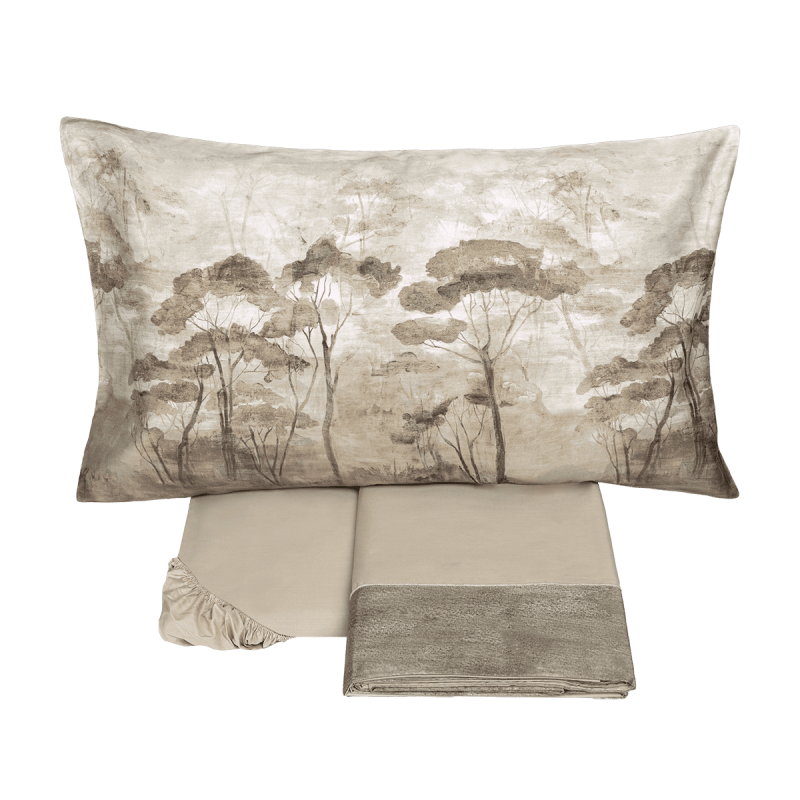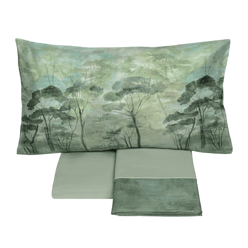 Le atmosfere mitologiche dei boschi abitati da ninfe e spiriti sacri hanno ispirato la collezione NEMORA. Il disegno, che rivela una texture mossa appena percettibile ripresa nella balza del lenzuolo. Proposta nelle calde tonalità neutre o nei verdi di stagione, la collezione in prezioso raso invita a ritrovare il proprio benessere nella natura incontaminata.