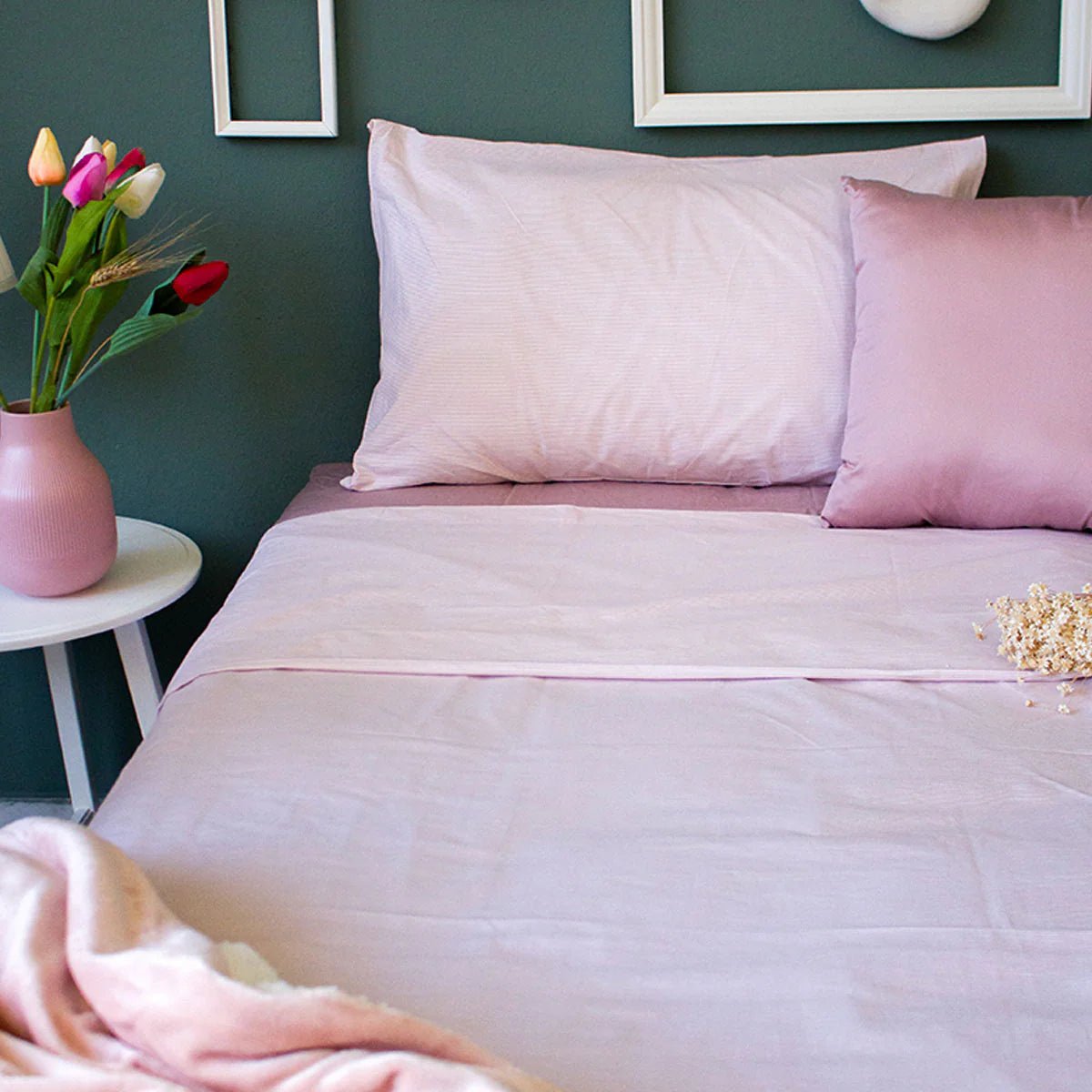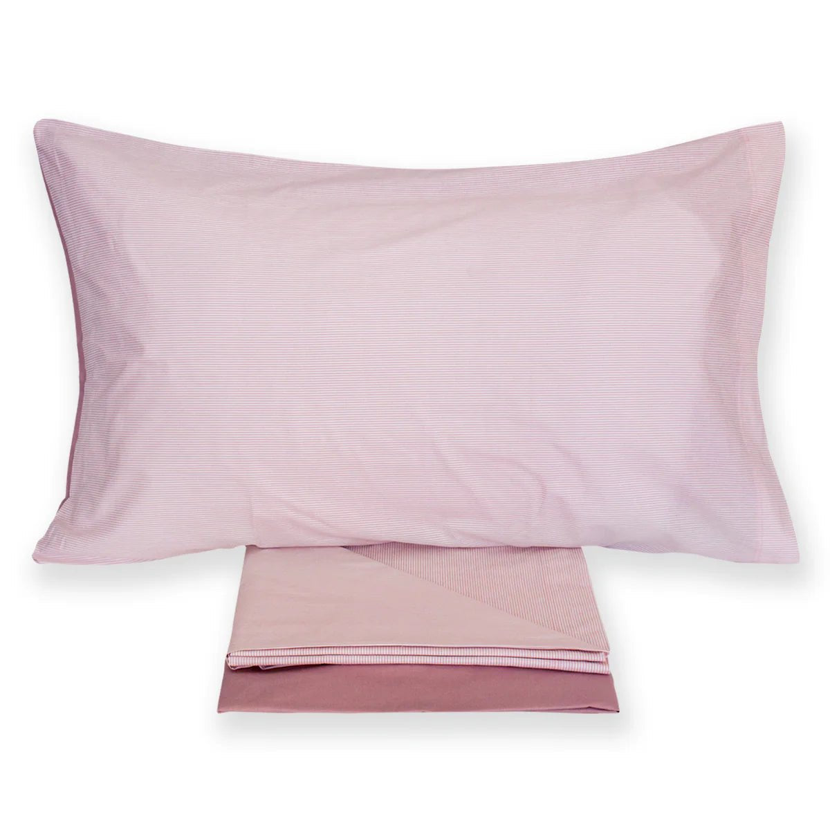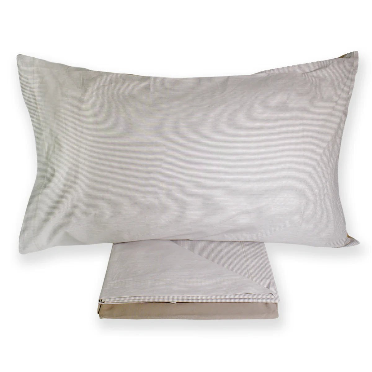 Completo lenzuola matrimoniale in puro cotone con 4 federe due tinta unita, due a righe .