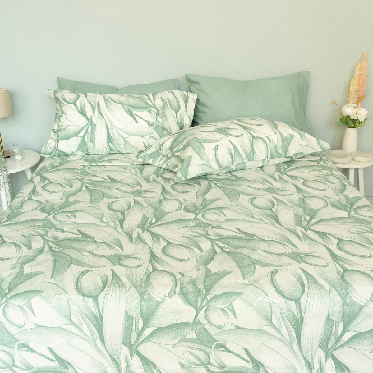 Il completo lenzuola OLANDA di Maestri Cotonieri è realizzato in 100% puro cotone e impreziosito da una delicata fantasia con fiori di tulipano, simbolo di raffinatezza e armonia.