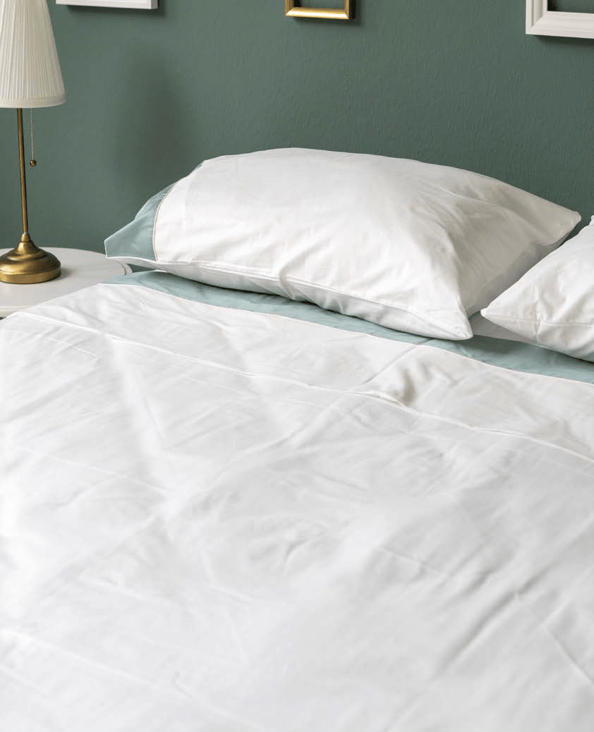 Lenzuola in cotone tinta unita bianco con bordo colorato in raso.