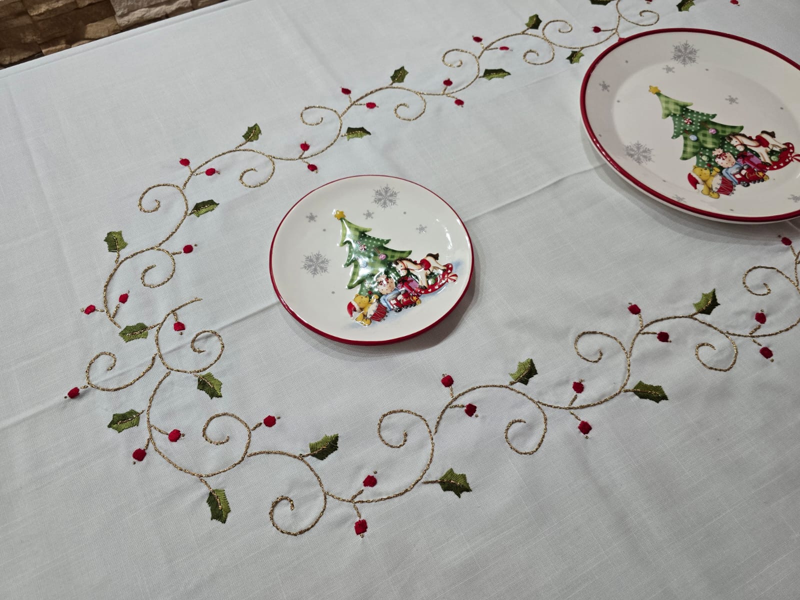 Tovaglia in puro lino ricamato punto pieno a mano natalizi.