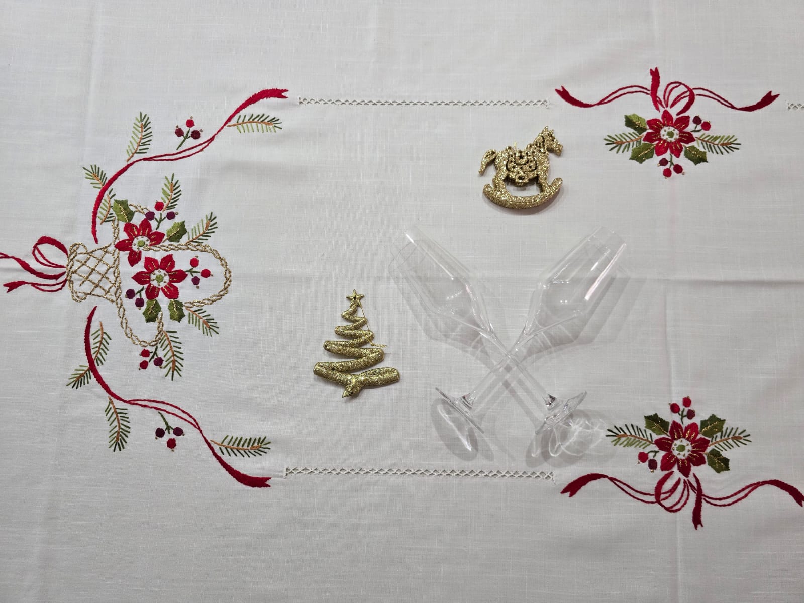 Tovaglia in puro lino ricamato punto pieno a mano natalizi.