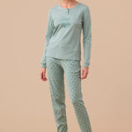 Pigiama donna in caldo cotone. Top unito a due bottoni con stampa al centro. Pantaloni con stampa cuoricini e polsini.