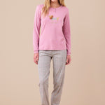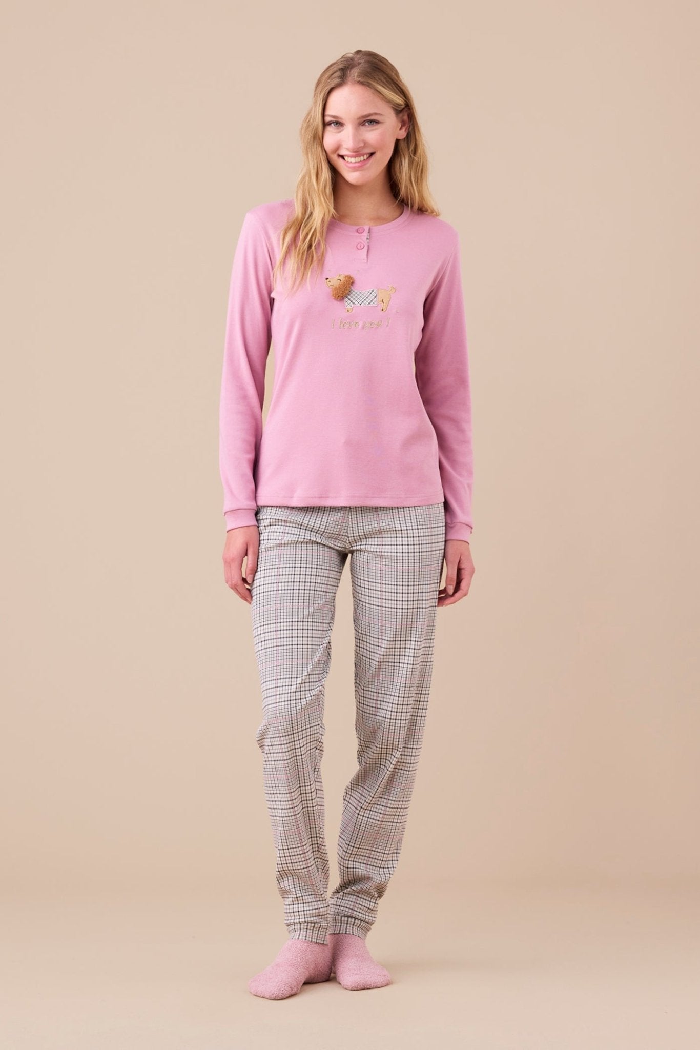 Pigiama donna in caldo cotone con stampa principe di Galles. Top con due bottoni e cane applicato e pantaloni con tasche e polsini sul fondo.