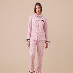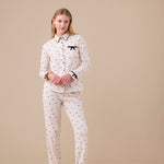 Pigiama donna in caldo cotone con fantasia fiocchi. Camicia con bottoni e pantaloni con volant per un look romantico e confortevole.