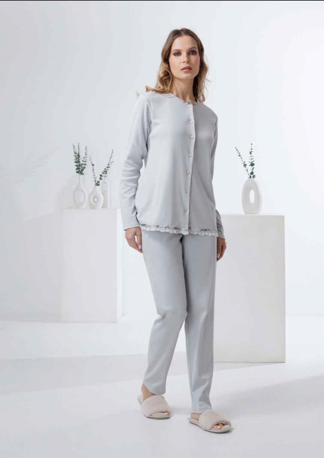 Pigiama in caldo cotone, maglietta totalmente aperta con bottoni e applicazione di rouhes sul bordo.