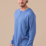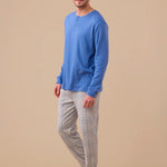 Pigiama uomo in caldo cotone, top di colore unito con collo a tre bottoni e pantaloni in stampa scozzese con polsino.