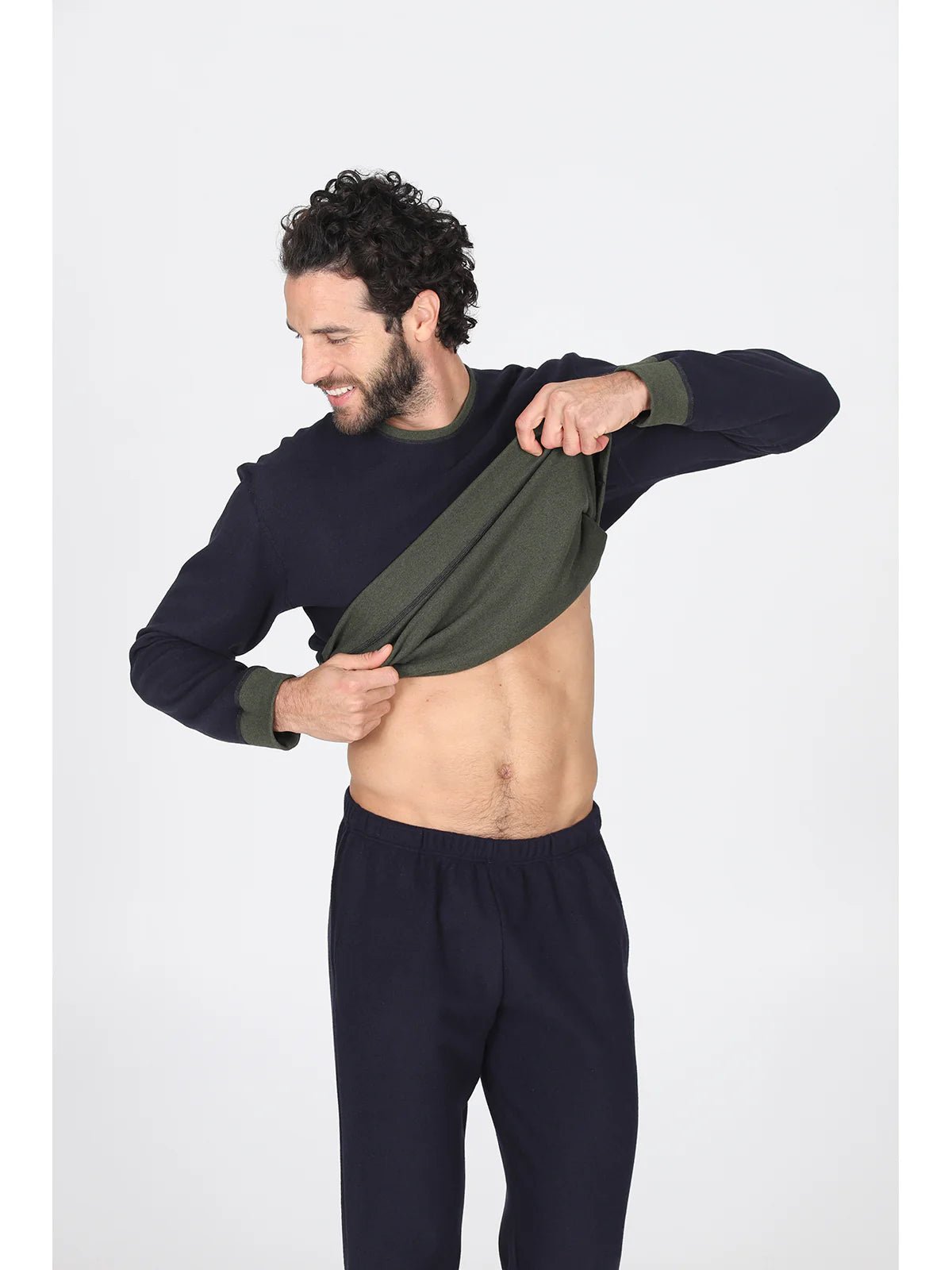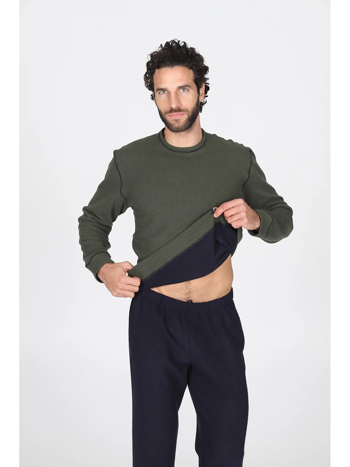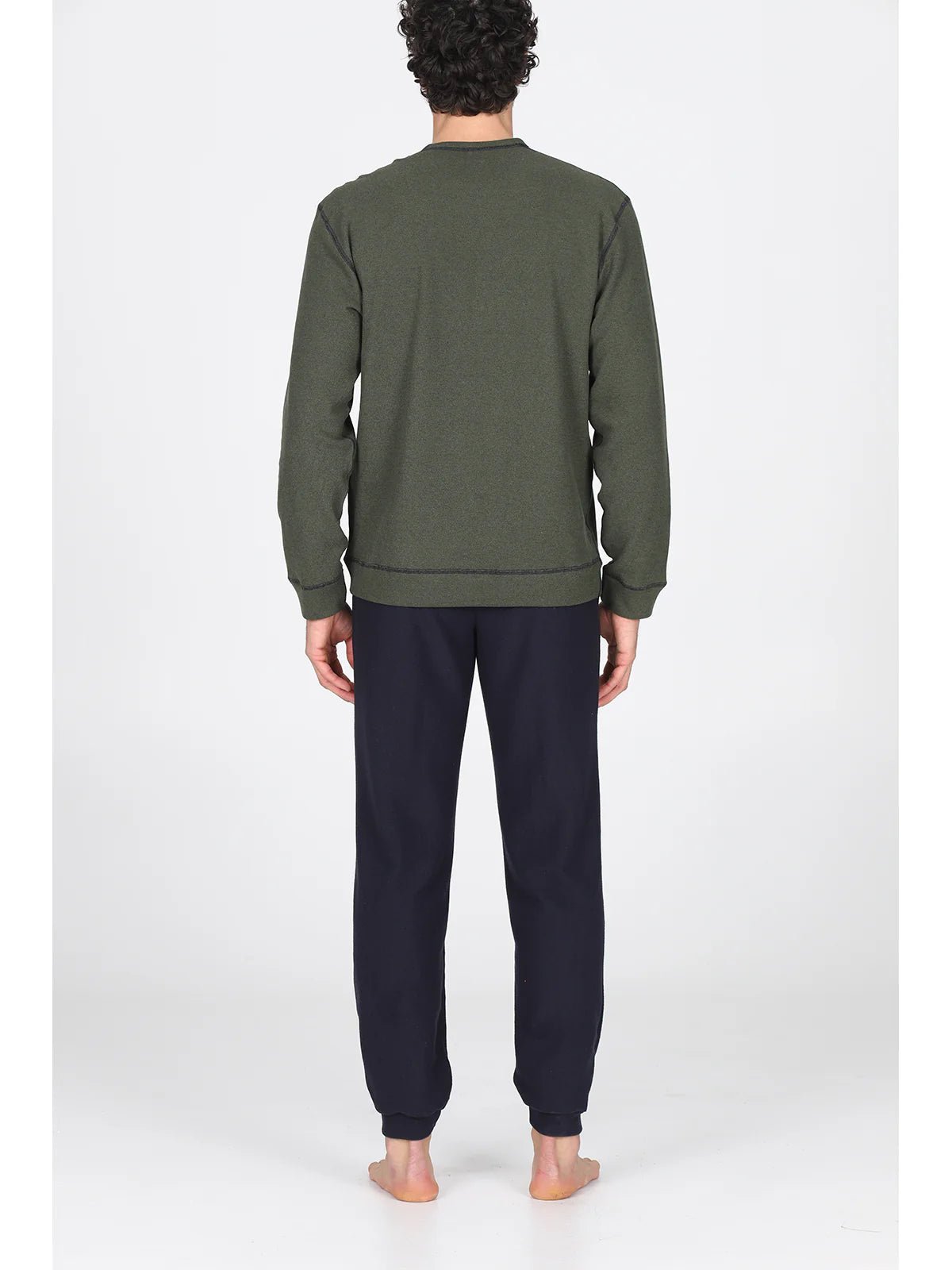Scopri un'incredibile combinazione di eleganza e comfort con questo pigiama girocollo, un must-have per l'uomo moderno che non vuole rinunciare allo stile nemmeno nei momenti di relax. Grazie al suo design double face, potrai scegliere tra un raffinato verde/blu o un sofisticato moro/grigio, adattandolo facilmente al tuo umore e all'ambiente.