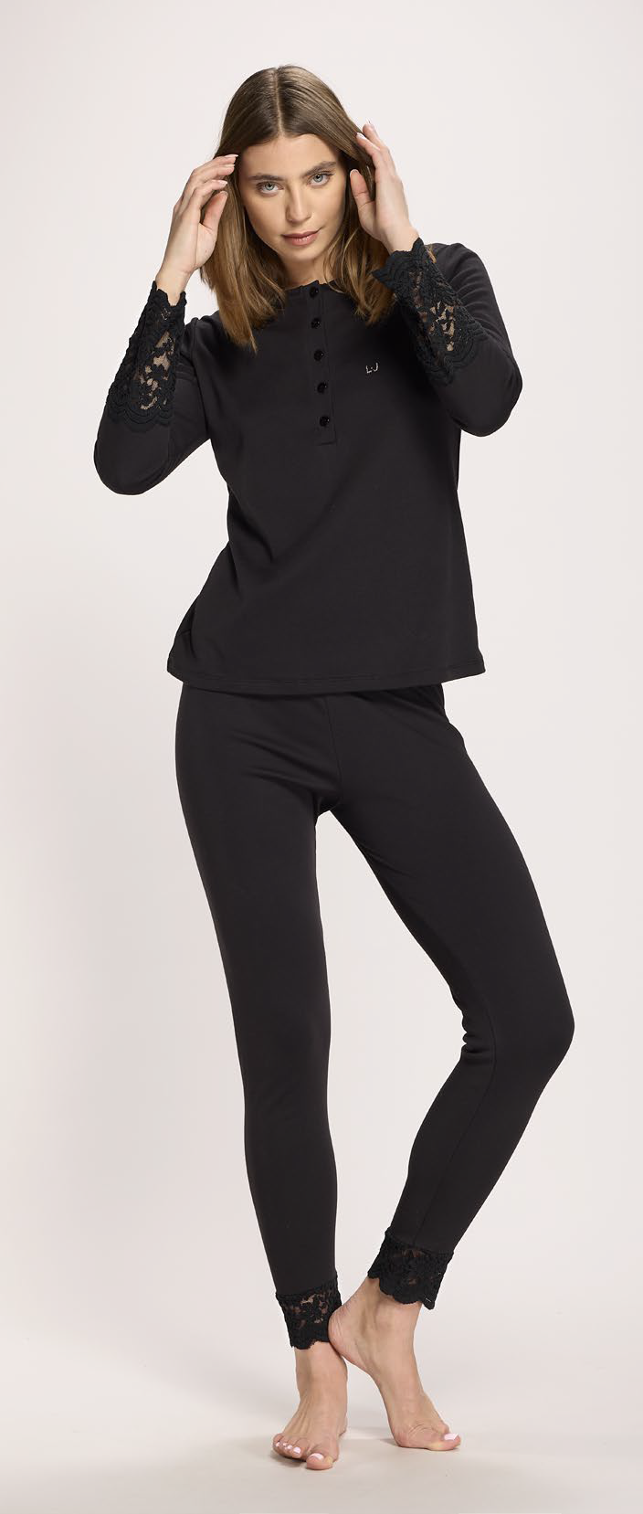 Pigiama da donna in caldo cotone con maglietta bianca a serafino con applicazione di pizzo sulle maniche e pantalone liscio nella variante grigio perla.