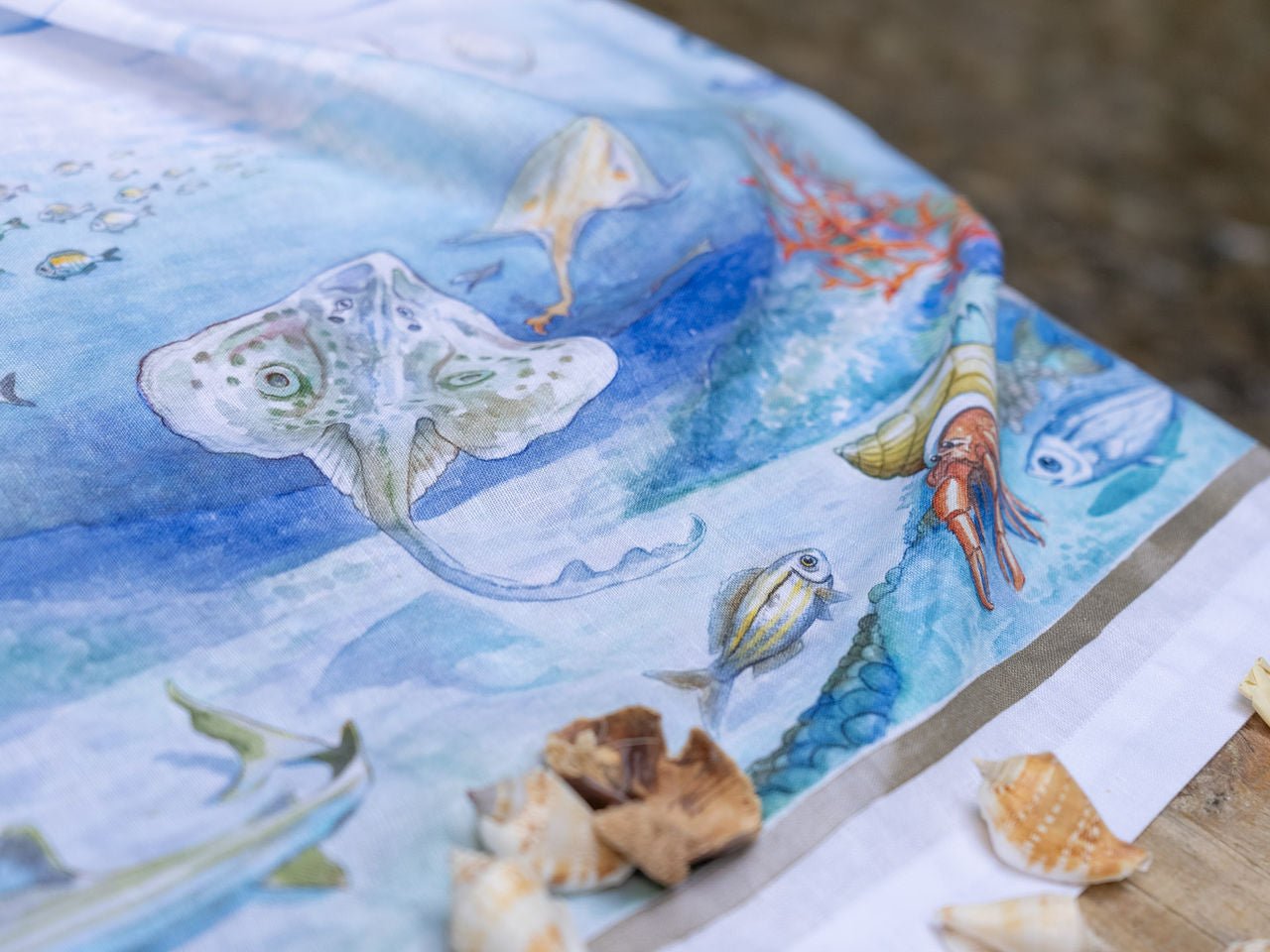 Il runner ISUELA in candido lino mette in scena lo spaccato di un fondale marino del Mediterraneo. Per una serata a due sognando vacanze sulla riva del nostro Mare .