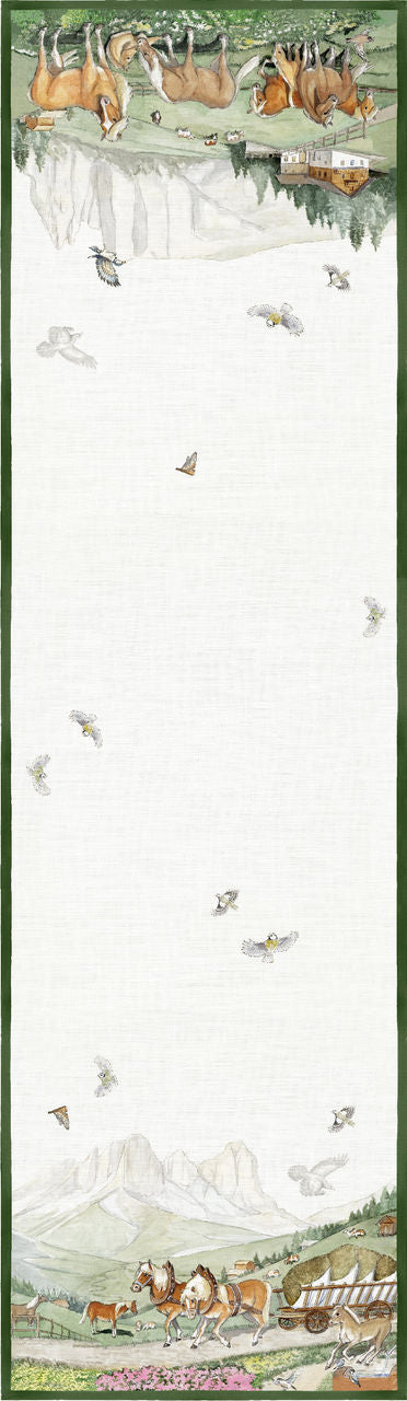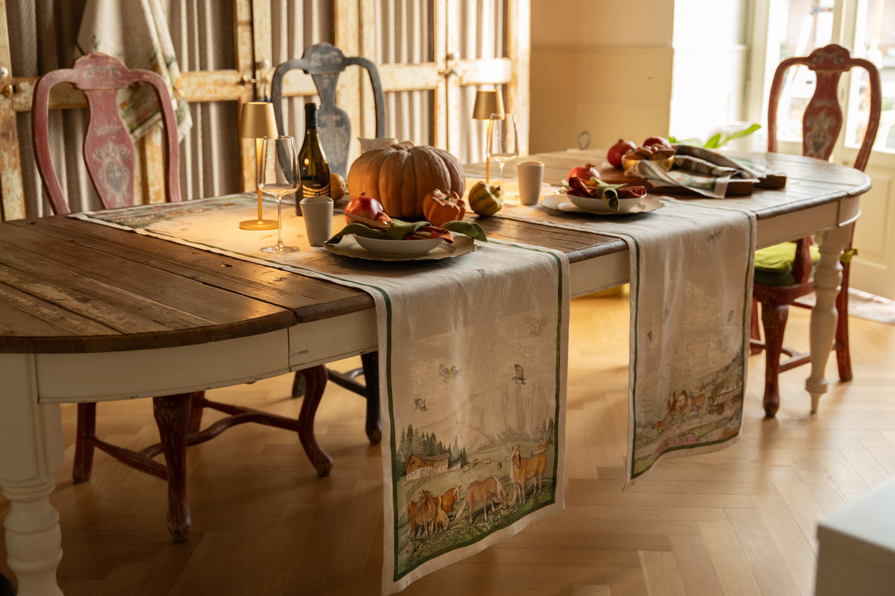 Arreda la tua sala con il runner Maso in puro lino ed apri le finestre su uno dei panorami più belli delle nostre Dolomiti, con maestosi cavalli Aveglinesi al pascolo sugli alpeggi.