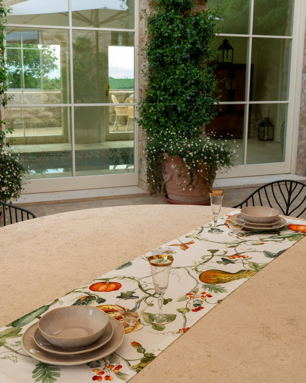 Il runner da tavolo KURBIS crea un passaggio che profuma di vendemmia e di giornate tiepide al tramonto. Ogni dettaglio racconta la generosità della stagione. Le zucche mature si intrecciano tra fiori e tralci che si intrecciano. L'arancio, l'oro e il lilla si sposano con il verde delle foglie. È un invito a rallentare, ad assaporare la bellezza semplice e poetica della natura in festa.