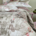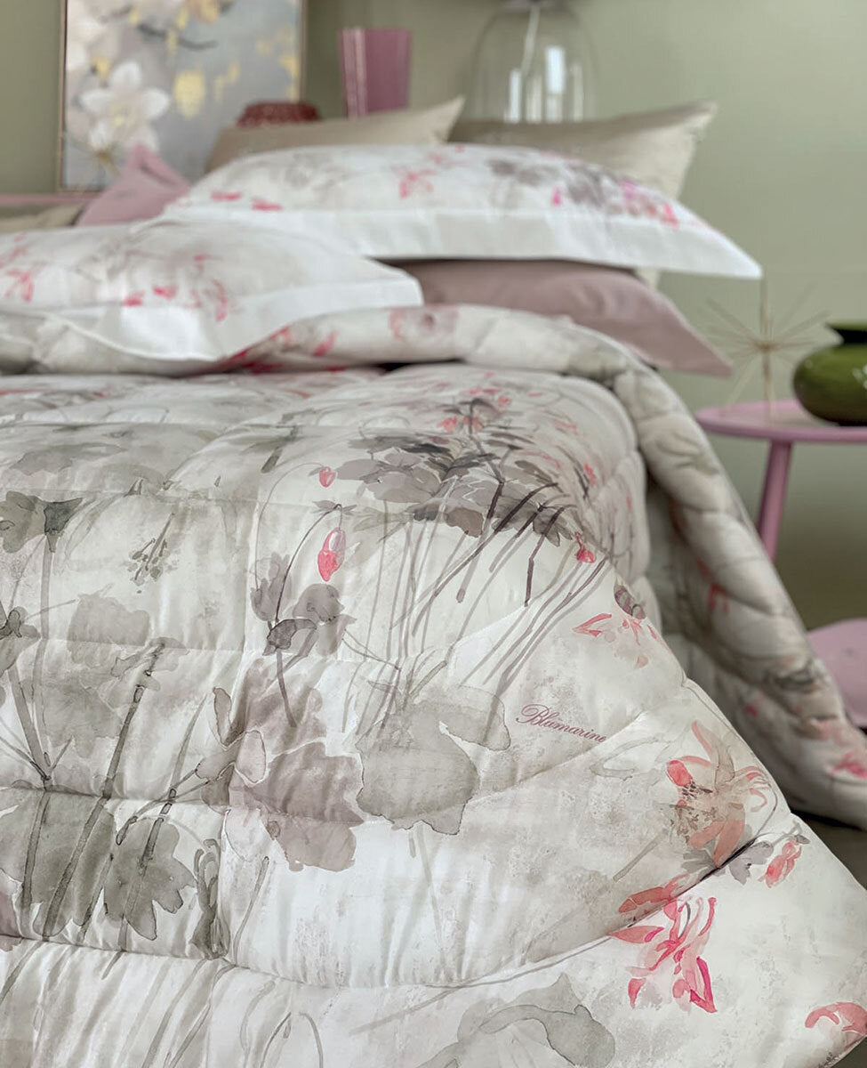 Trapunta matrimoniale con stampa all-over su raso di cotone e logo Blumarine stampato nella trama.