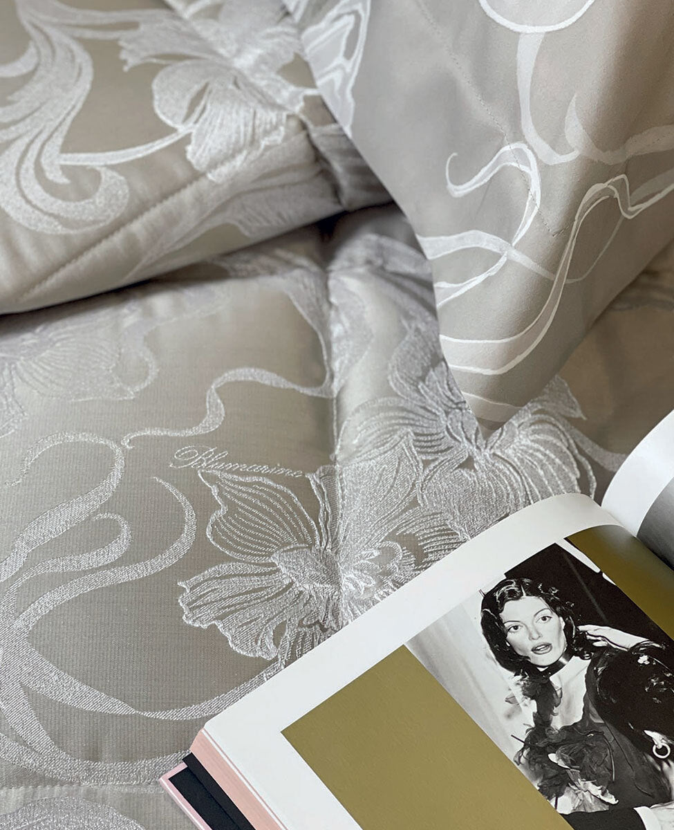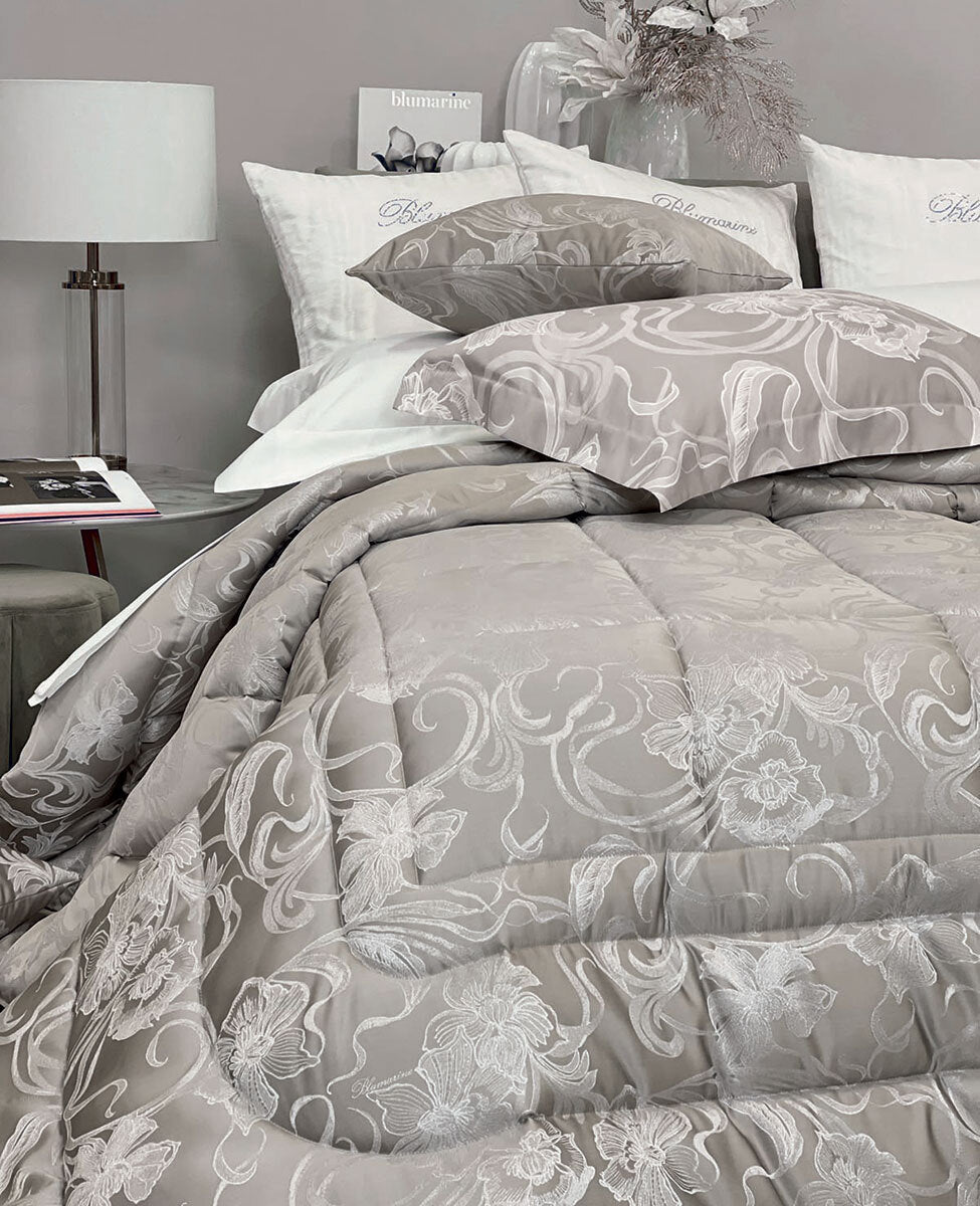 Trapunta matrimoniale in jacquard con logo Blumarine nella trama del tessuto.