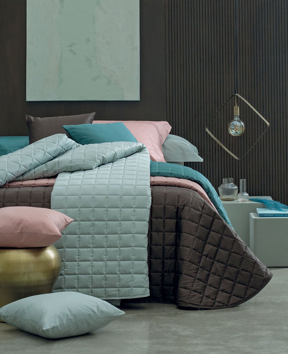 Copriletto matrimoniale trapuntato in raso tinta unita.