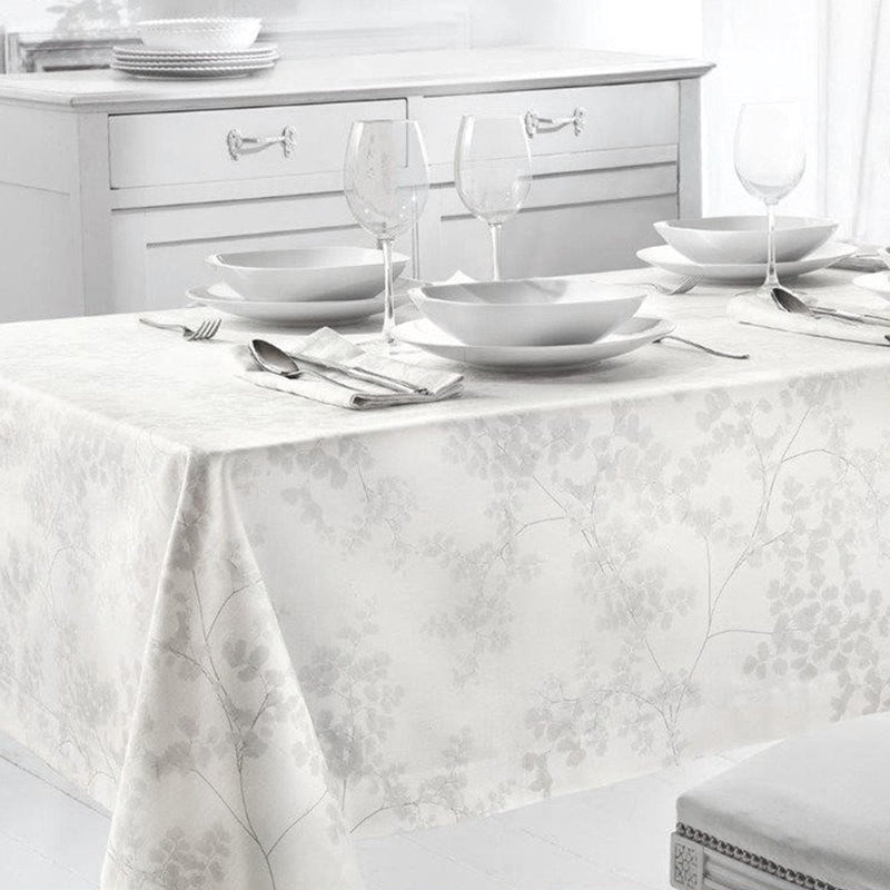 Tovaglia in raso di puro cotone della linea Venere di Vallesusa Casa con delicata fantasia ramage tono su tono per una sala da pranzo di lusso. Questo servizio da tavola è dotato di tovaglioli! Prodotto Made in Italy