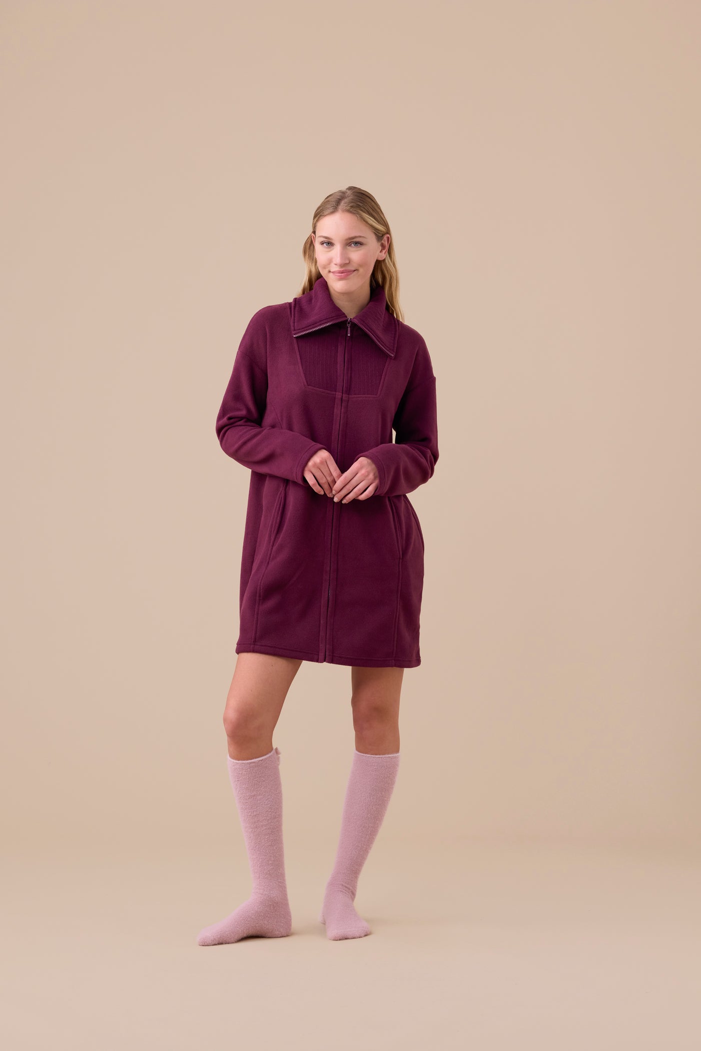 Vestaglia donna in micropile con zip, tasche laterali e colletto ampio dal taglio geometrico.