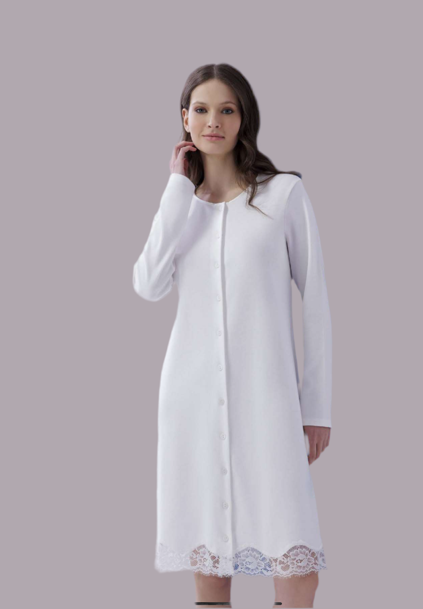 Camicia da notte aperta in caldo cotone con applicazione di pizzo sul bordo.