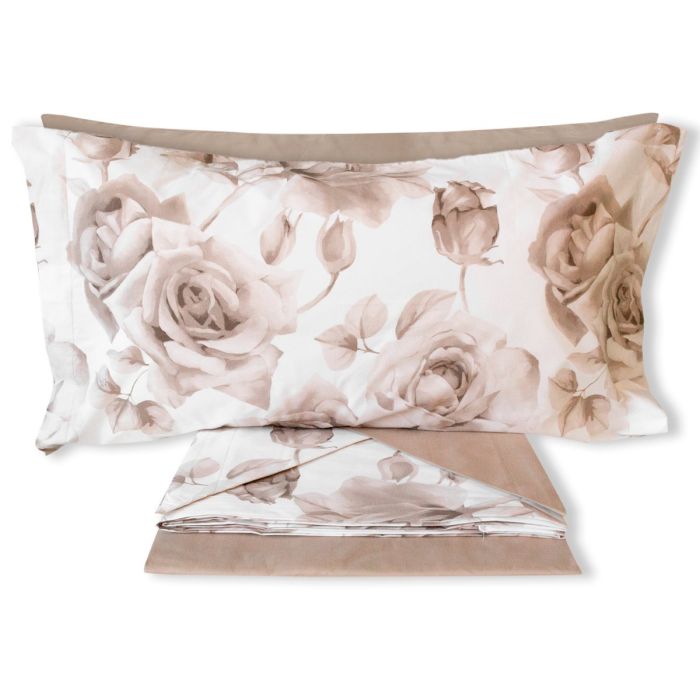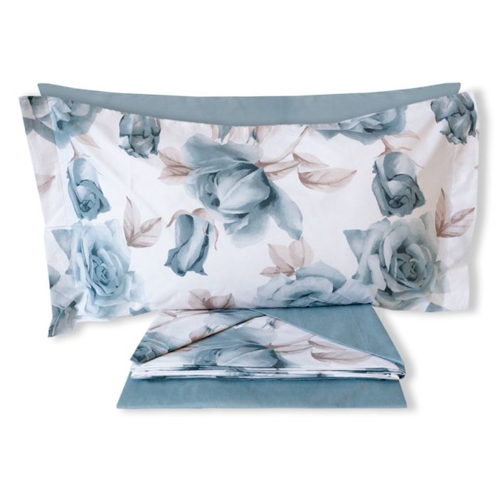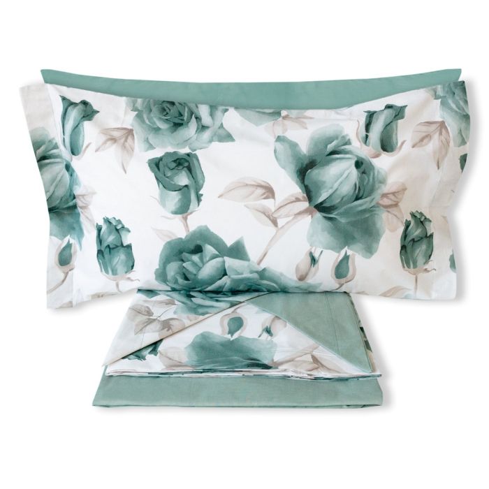 Completo Lenzuola Malaga matrimoniale a fantasia in puro cotone con 4 federe 2 unite e 2 a fantasia.
