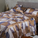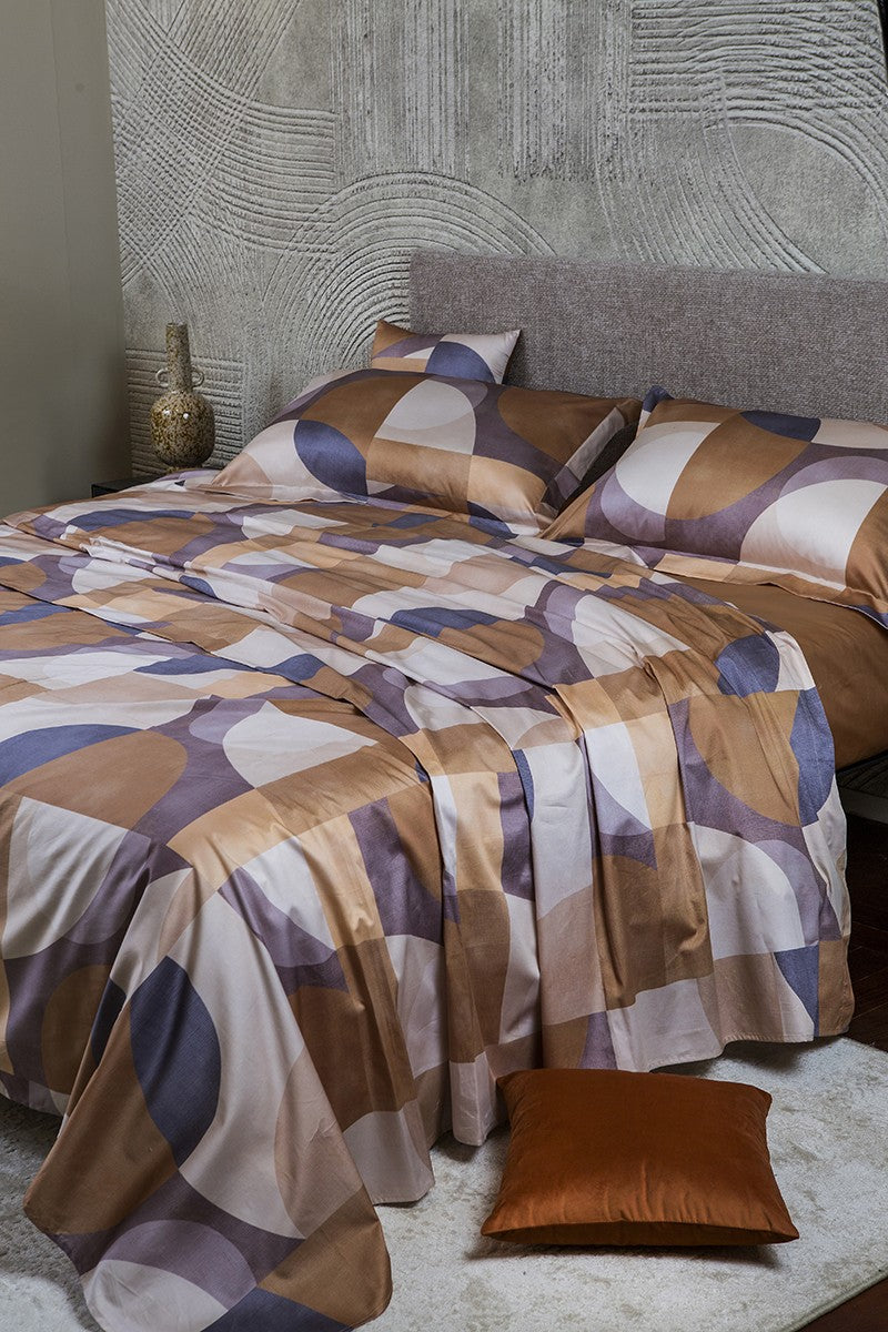 Completo letto Chamonix : il piacere di dormire inizia dalle lenzuola in raso satin 100% 300 TC stampa digitale con disegno geometrico frutto di creatività e cura artigianale.
