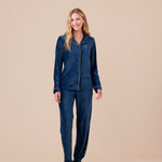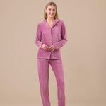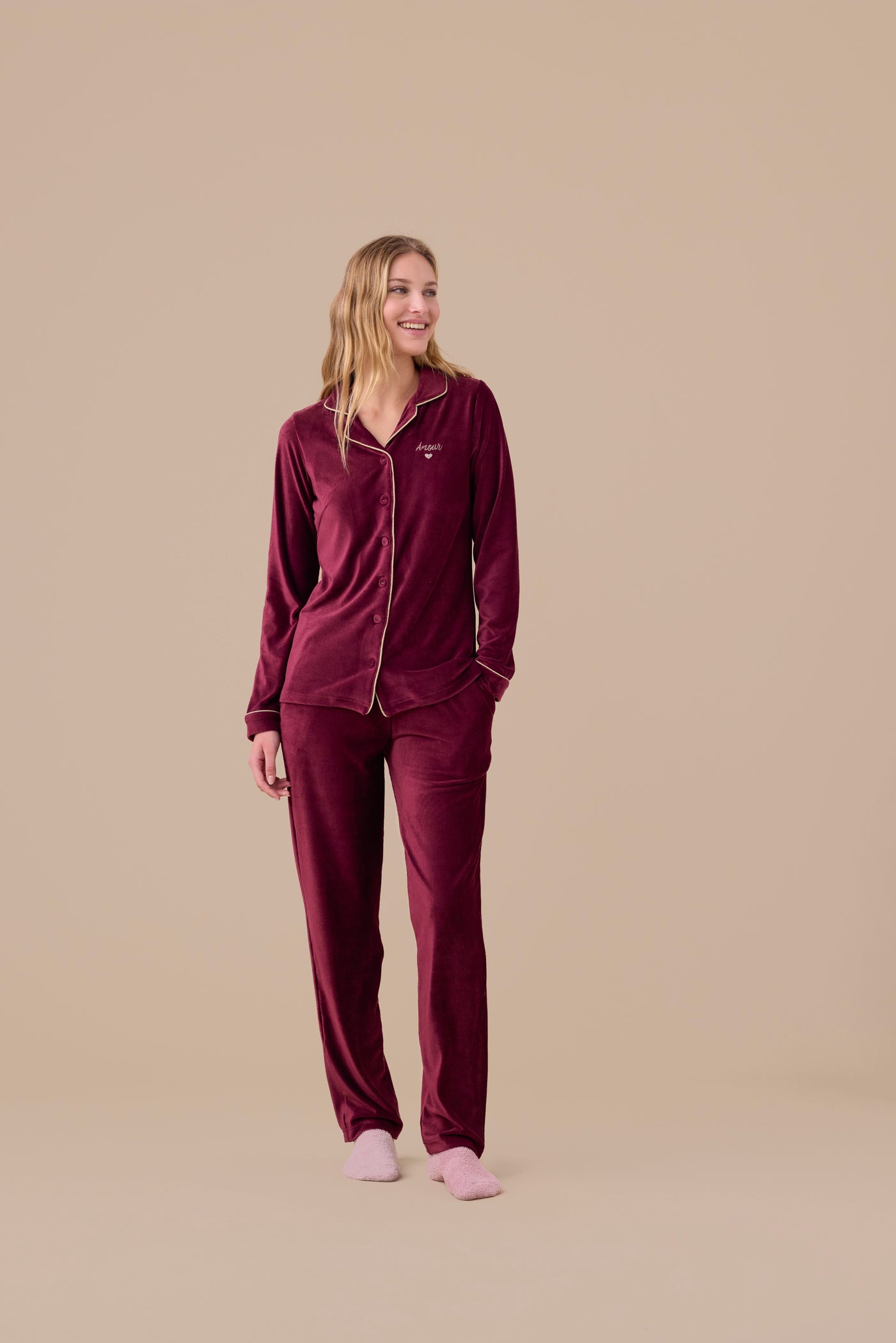 Pigiama donna in ciniglia a coste e piping a contrasto. Top con abbottonatura sul davanti e dettaglio scritta ricamata e pantaloni con tasche.