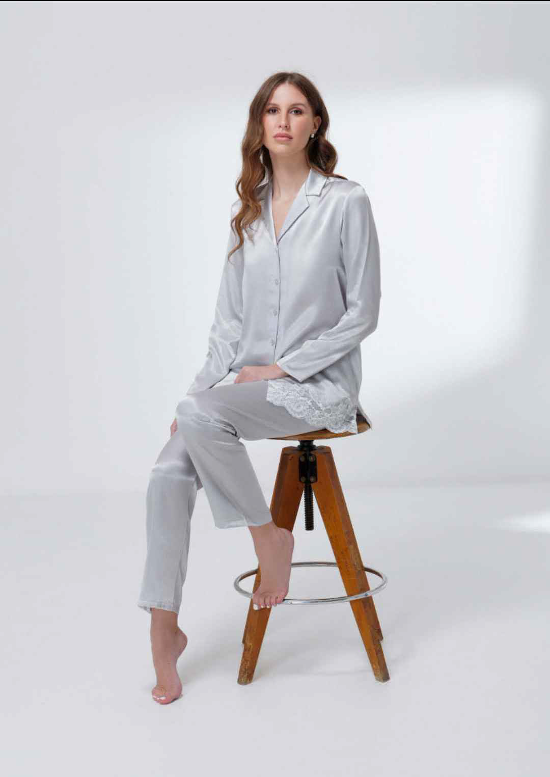 Pigiama taglio uomo in raso con applicazione di pizzo sul bordo.