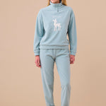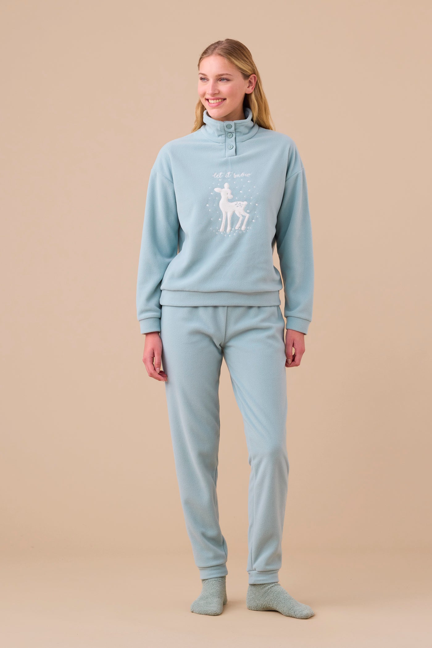 Pigiama donna in micropile unito.Top con ricamo e applicazione al centro. Pantaloni con polsini.
