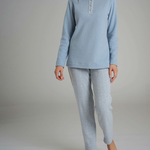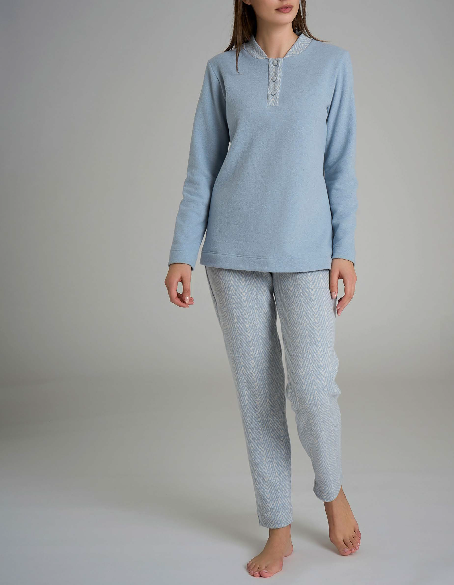 Pigiama serafino in punto milano con maglietta tinta unita e pantalone a fantasia.